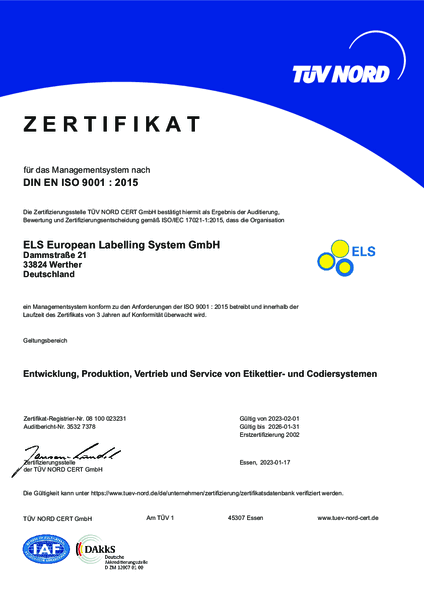 ELS European Labelling System GmbH zählt seit 1998 zu den führenden Herstellern von Etikettier- und Kennzeichnungssystemen für die Codierung und Aufbringung von Haftetiketten. Systeme von ELS erfüllen höchste Anforderungen an Qualität, Sicherheit, Präzision und Wirtschaftlichkeit. Sie werden zuverlässig in der Lebensmittel-, Medien-, Kosmetik- und Pharmaindustrie eingesetzt – auch in sensiblen Hygienezonen.